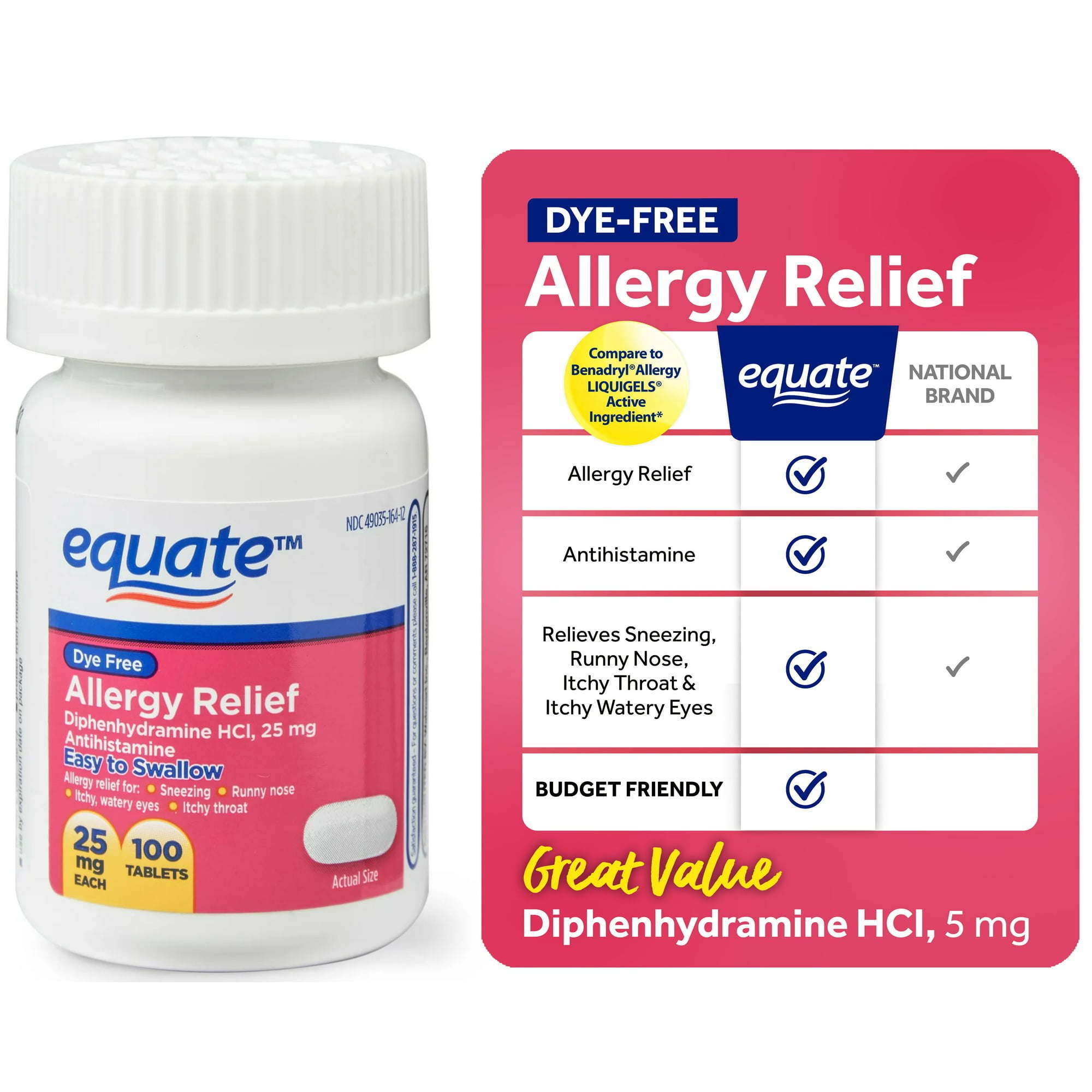 Drug Facts: Active ingredient (in each tablet) - Diphenhydramine HCI 25 mg - Purpose - Antihistamine. Temporarily relieves these symptoms due to hay fever or other upper respiratory allergies: runny nose; itchy; watery eyes; sneezing; itching of the nose or throat; temporarily relieves these symptoms due to the common cold: runny nose; sneezing. Control your runny nose; itchy throat; and watery eyes with Equate Dye-Free Allergy Relief Tablets. Our formula contains the active ingredient diphenhydramine HCI; a powerful antihistamine designed to help relieve allergy symptoms brought on by pollen; pet dander; and the common cold. This anti-allergy medicine for kids and adults is available in a convenient 100-count bottle; so you will have plenty of tablets for when you need them the most. Allergies can hit you anytime and anywhere; so rely on Equate Dye-Free Allergy Relief Tablets to feel better fast. Making the right health decisions can be challenging. With a complete range of products and simple solutions; Equate allows you to take care of your family with confidence.